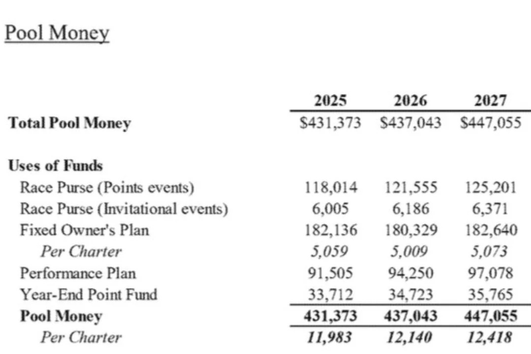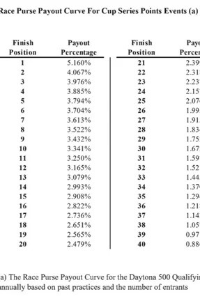Devido à natureza mutável do cálculo, a NASCAR notificará todas as equipes titulares de carta sobre o pagamento do Plano de Desempenho para a temporada seguinte dentro de 30 dias corridos após os resultados finais de cada temporada.